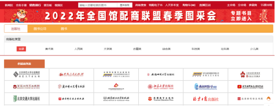 1、主会场:其右上角展示图采会开幕式领导讲话及平台消息发布。其他板块主要展示重点出版社书目,直接点击出版社名称即可进入选书界面。