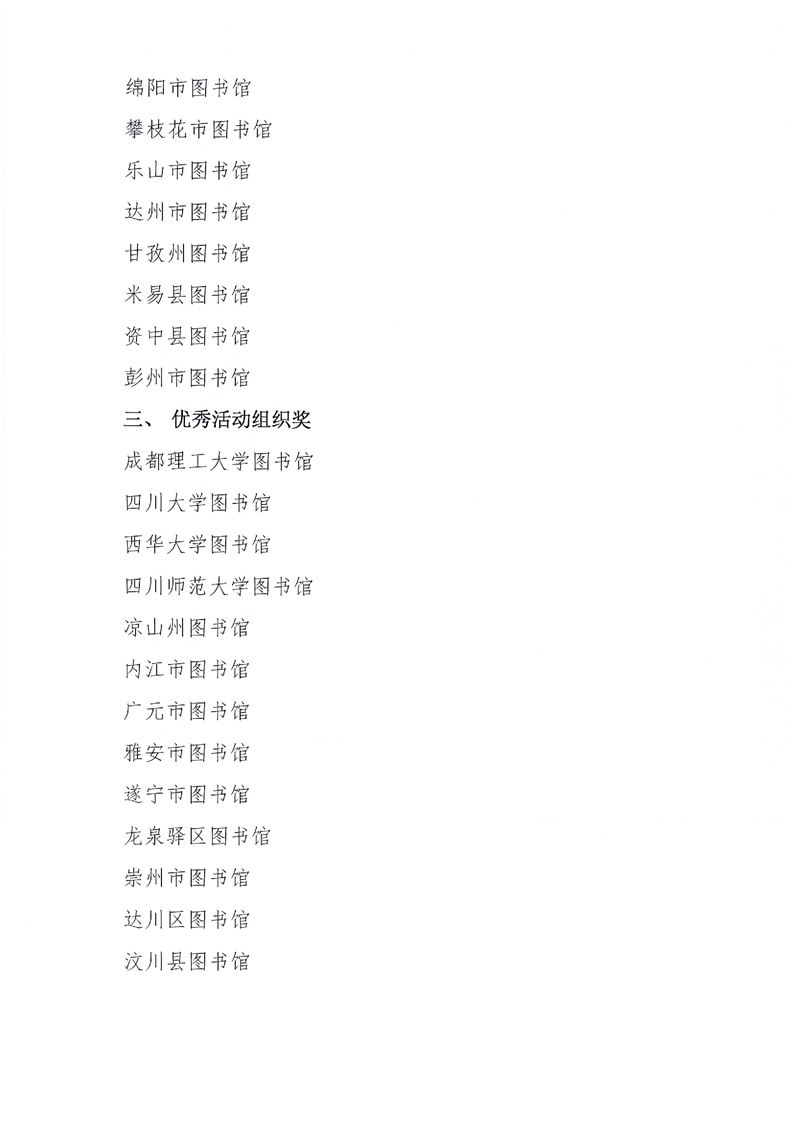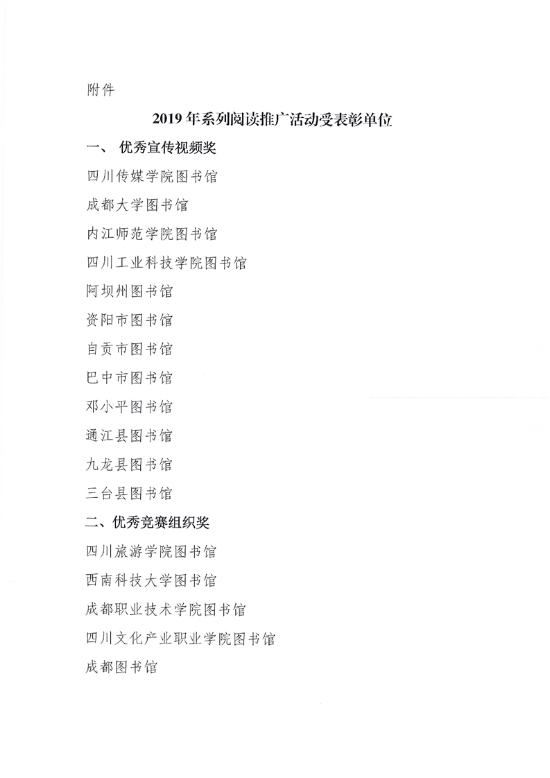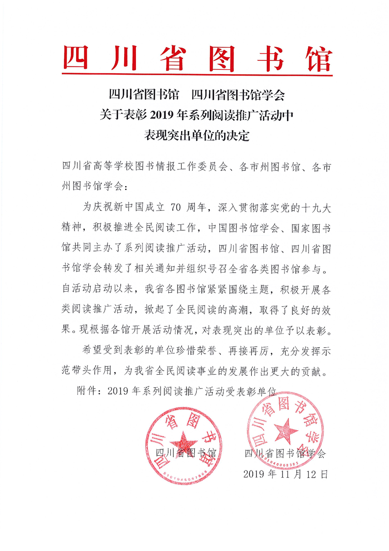 四川省图书馆四川省图书馆学会关于表彰2019年系列阅读推广活动中表现突出单位的决定