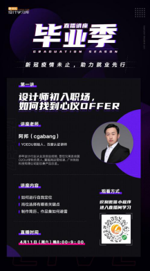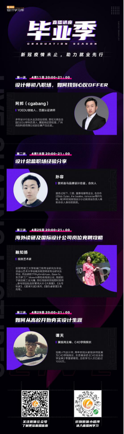 为响应教育部日前发布《教育部关于应对新冠肺炎疫情做好2020届全国普通高等学校毕业生就业创业工作的通知》、《教育部办公厅关于开展2020届高校毕业生全国网络联合招聘——24365校园招聘服务活动的通知》等文件精神,助力高校毕业生就业创业及升学深造指导。特举办《毕业季——疫情未止,就业先行》系列讲座。翼狐设计学习库决定集合设计行业专家、资深从业者、设计创业者从不同方向为大家开讲。