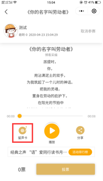 2.报名完成后,还可以在【我的作品】中找到“参赛中”的作品,制作成精美的留声卡,分享到朋友圈。