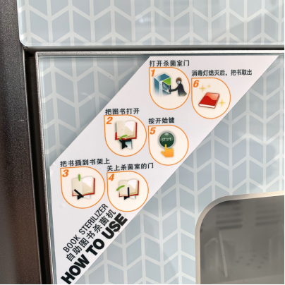 按照机身上的提示步骤,将图书平整展开,放入消毒机的支架上,一次最多可放入6本书;