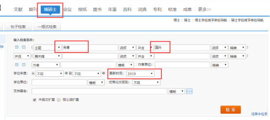 例如:点击高级检索后,选择文献类型为博硕士论文,主题包含传媒和国外,更新时间为2019年,读者可根据所需,自行设置筛选条件。