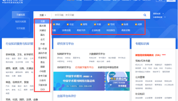 检索方式:中国知网首页的默认检索框即为统一检索的输入框,实现多种资源类型的一站式检索和发现,同时,也可以根据需求选择知识元检索以及引文检索。