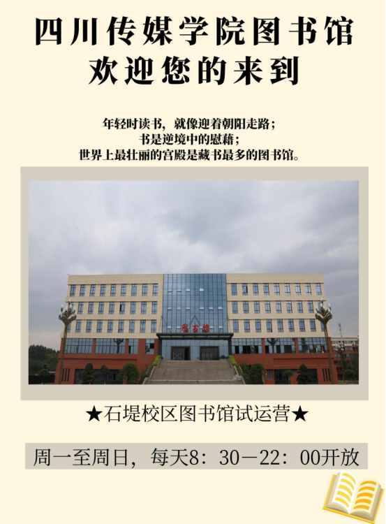 试运行期间,图书馆周一至周日,每天8:30-22:00开放,图书馆全体工作人员热诚欢迎同学前往。