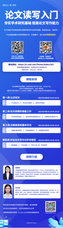 为了帮助同学们提高论文写作能力,提高学术规范和学术道德意识,我校图书馆联合中国知网研学平台事业部共同举办“论文读写入门”系列公益讲座,为大家直播讲解选题、开题报告、文献检索、论文写作、学术规范等内容。