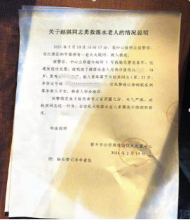 2021年2月10日,在河南省新乡市赵淇的家乡,一位老人不慎坠入河中,众人都在呼喊救人,但没人敢下水。在这危急时刻,赵淇同学连衣服都没来得及脱,毫不犹豫跳进冰冷的河水里,几经努力,在众人的帮助下成功地将落水老人救上岸来。他的纵身一跃,展现了四川传媒学院学子的风采和正能量,同时彰显出他骨子里的善良与勇敢,赢得众人的赞赏和当地公安机关的表彰。