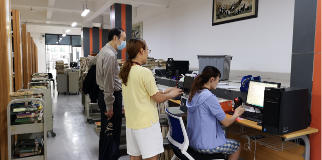 为更好的保障新学期图书馆开馆工作有序进行,图书馆组织召开三次会议进行工作部署;重视安全,疫情特殊时期,修订《疫情防控操作规范》,并在馆长组织下集体学习,做好防疫宣传品的查缺补漏,排查各区域的安全隐患,检查细致入微到每一个角落的清洁卫生等。在2021年8月25日上午,学校副校长董孝璧又亲临图书馆检查指导工作。在流通部刘庆全程陪同下董副校长认真仔细查看了各楼层区域的图书归架及安全情况,对图书馆的工作的认真表示肯定和赞扬。在检查后,董副校长亲临C2区(四川省图书馆四川传媒学院分馆)图书数据的录入现场,了解数据加工和图书上架的完成情况并慰问全体人员。最后向图书馆提出了服务改善的建议。