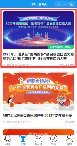 为进一步践行党的二十大精神,推进文化自信自强,铸就社会主义文化新辉煌,集聚守正创新的川渝力量,回首历史,展望未来,共同讲好新时代川渝故事,深化文明交流互鉴,全面推动川渝文化高质量输出,助力川渝文化更好地走向世界,四川省图书馆、重庆图书馆、成都图书馆、四川省图书馆学会、重庆市图书馆学会、成都市图书馆学会、四川省普通高等学校图书情报工作指导委员会、重庆市高等学校图书情报工作委员会、四川省中心图书馆委员会办公室将于2023年3月至6月联合川渝地区各图书馆共同举办2023年川渝地区“图书馆杯”全民英语口语大赛暨第六届“图书馆杯”四川全民英语口语大赛。