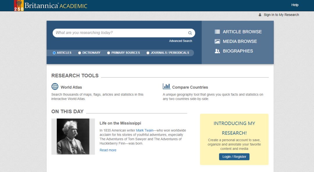 大英百科学术版是用户检索权威参考资料的首选工具。该系统不但包括大英百科全书(Encyclopaedia Britannica)本身的内容,还整合了Merriam-Webster's Dictionary(韦氏大词典)、EBSCO报章杂志以及其他众多研究工具提供的可靠资源。除文字条目外,还提供丰富的图片以及音频、视频资料。