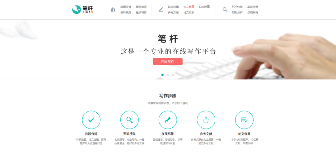笔杆网是一款基于大数据的写作与创新辅助工具,收录整理了超过5亿元数据,20亿引文数据,覆盖图书,期刊,学位论文,会议论文,报纸,标准,专利,互联网博客等文献类型。