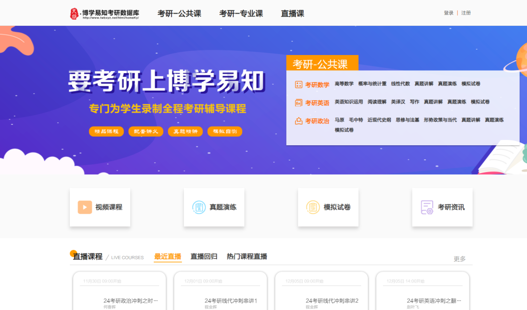 《博学易知考研数据库》是权威的考研视频学习平台,囊括考前指导、名校宝典、铭师讲堂、考研公共课、考研专业课、小语种考研、英语四六级、考研特训营八大类考研视频资源。