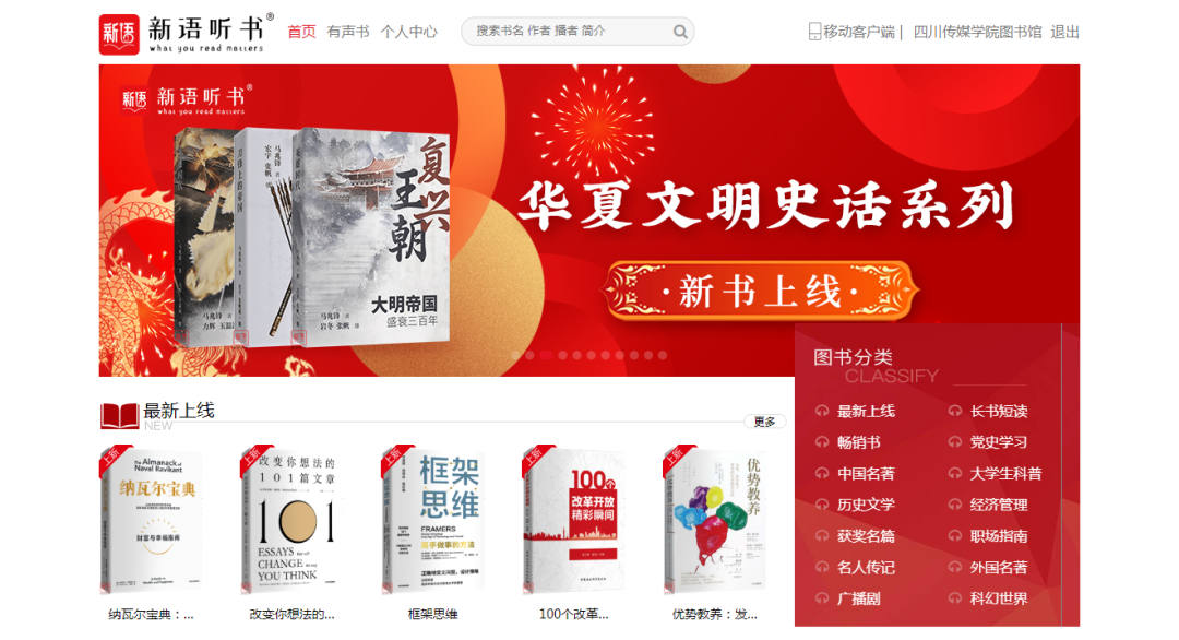 以国家正式出版物为主要内容的有声图书阅读平台。新语听书高校版累计出版有声书10万余集,合计3万小时。