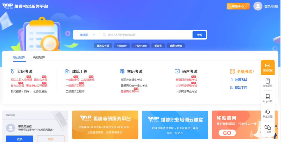 《维普考试服务平台》是集各项职业资格与高校课程考试资源于一体,包含海量试题试卷,并提供试题试卷浏览及查询、多渠道考前练习的考试、学习辅助系统。