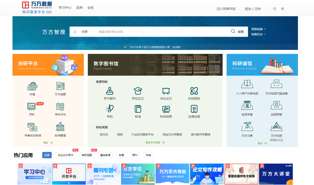 提供中国学术文献、外文文献、学位论文、报纸、会议、年鉴、工具书等各类资源统一检索、统一导航、在线阅读和下载服务。