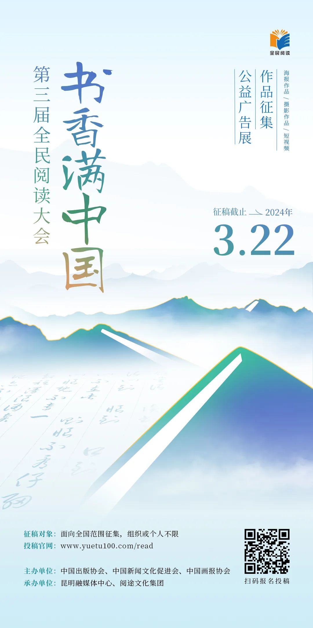 为展示优秀的全民阅读公益广告作品,传递读书力量,营造“爱读书、读好书、善读书”的良好氛围,提升公众对阅读价值的认知和理解,拟举办第三届全民阅读大会“书香满中国”公益广告展,现面向全国公开征集全民阅读主题优秀海报、摄影及视频作品,符合条件的作品将予入展。