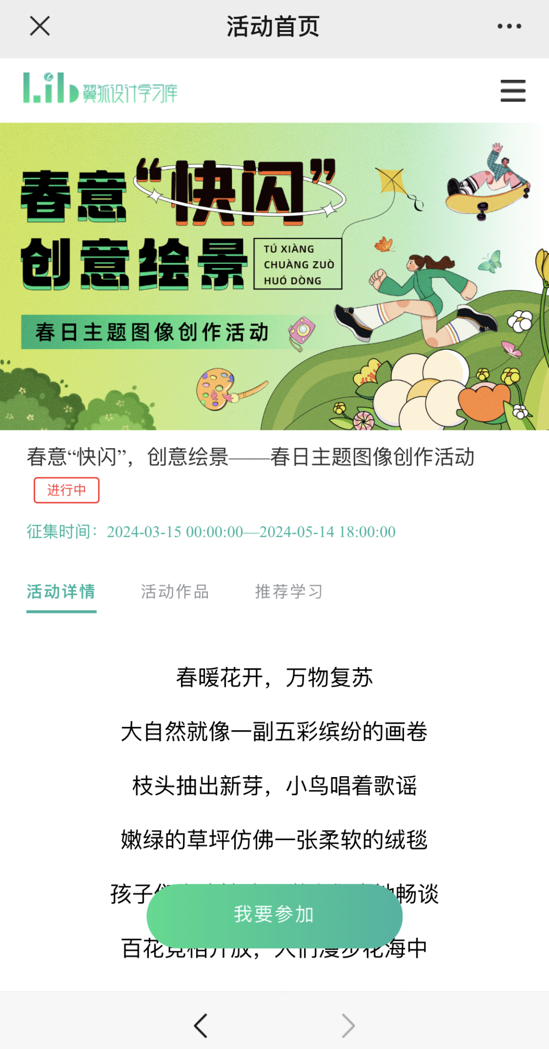 1、关注“翼狐设计学习库”公众号,回复“春意”即可进入活动页面报名参加活动。