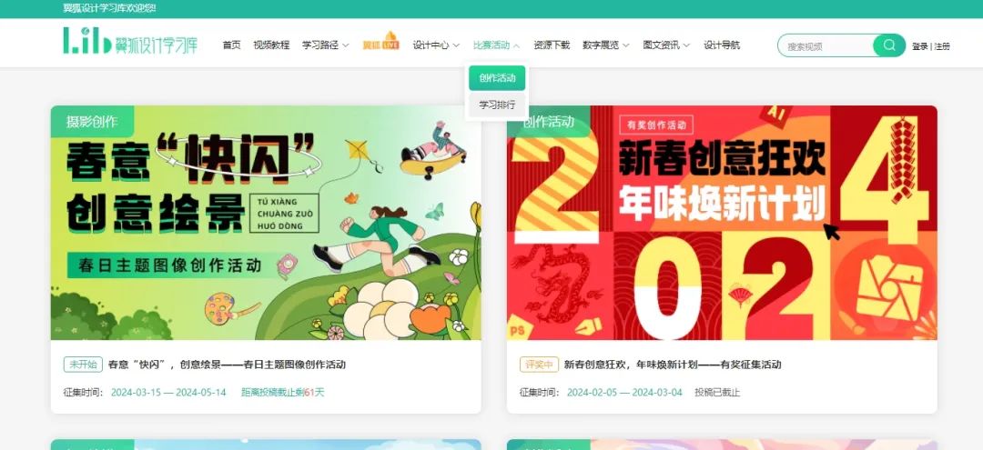 3、通过图书馆官网,找到“翼狐设计学习库”,进入“比赛活动”-“创作活动”找到活动入口即可参与。