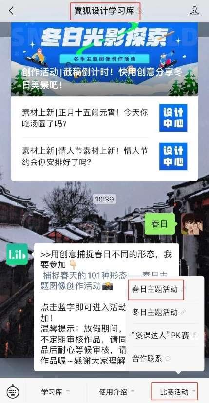 2、在“翼狐设计学习库”公众号,点击菜单栏,选择“比赛活动”-“春日主题活动”即可进入活动页面报名参加活动。
