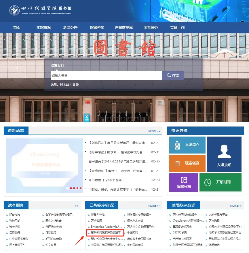 搜索登录“四川传媒学院图书馆”官网(https://lib.scmc.edu.cn/),点击“数字资源”板块,如下所示: