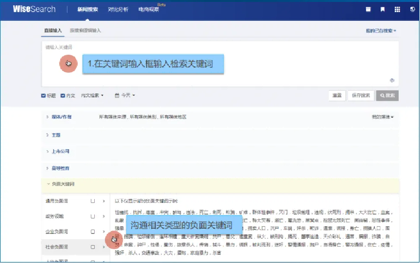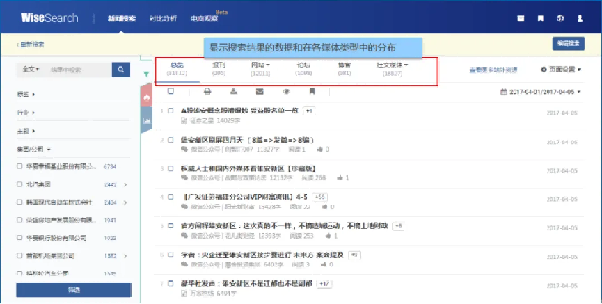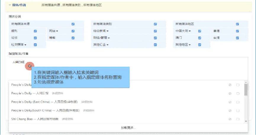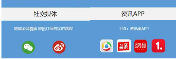 1.媒体资源:精准、可靠、全面、及时的媒体资讯库采用全媒体理念打造一站式搜索,数据库中不仅涵盖丰富的平面媒体资源包括1200+报刊、同时还收录18,000+ 网站,1500+论坛、贴吧、博客、APP和240,000+社交媒体的新闻资讯,用户可从全景角度了解事件的新闻报道情况;