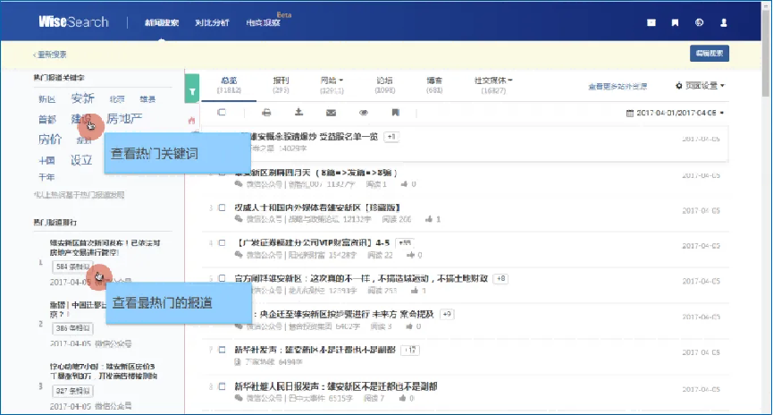 4.智能分析:突破传统的新闻检索、新闻浏览,致力于高校用户在新闻传播分析、案例研究的特别需求;智能的分析图表,最常用的分析视角,使分析结果直观呈现,快捷导出分析图表;灵活的案例分析工具,可自主设置对比分析项,11大常用对比分析维度;