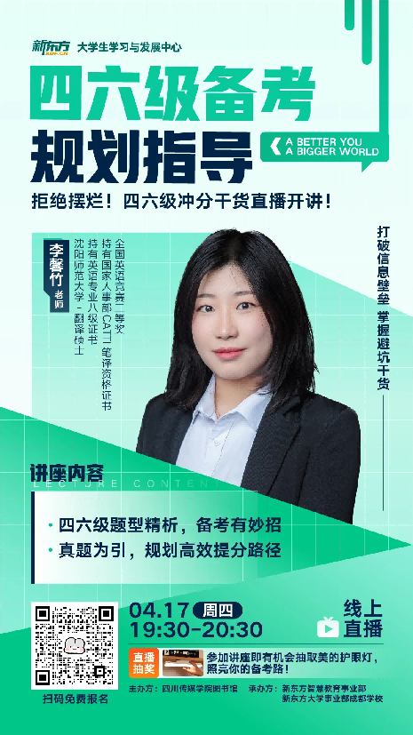 为了帮助大家理解题型掌握技巧,从而进行高效备考、精准击破考试难点,成都新东方为川传学子带来“四六级备考规划指导”线上主题讲座!