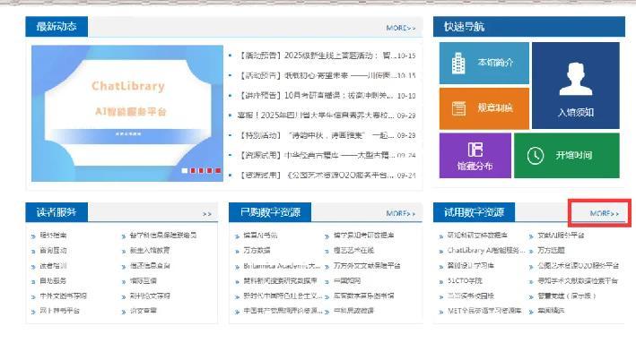 访问【四川传媒学院图书馆官网】,点击【试用资源(MORE)】-【中国古籍图典资源库】即可访问数据库。